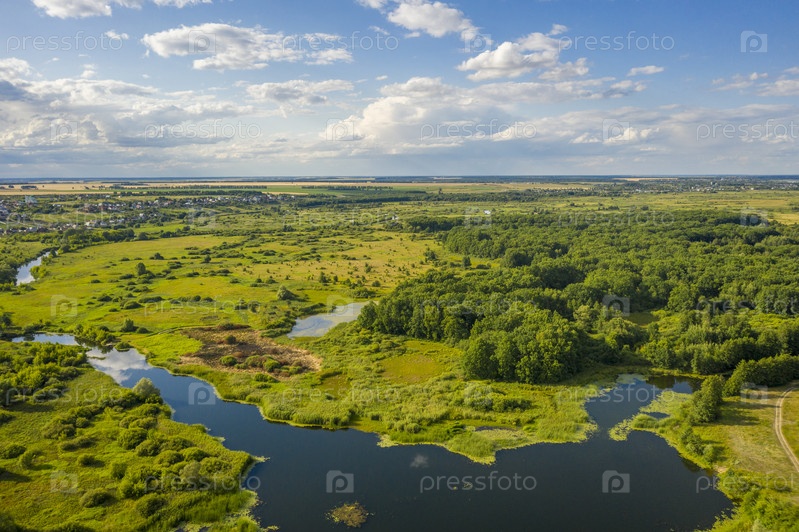 Вид с высоты птичьего полета на изгибы речных лугов и полей