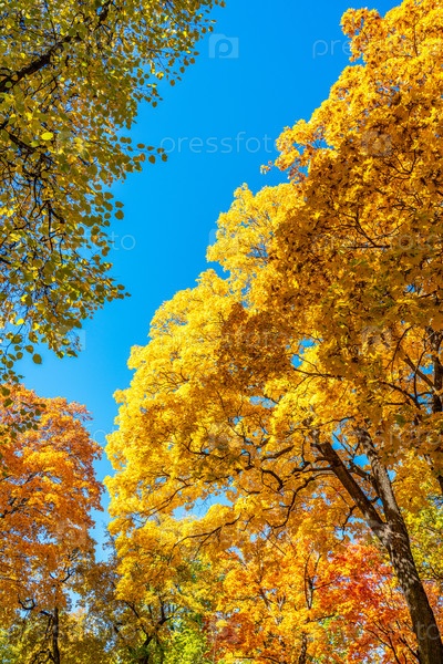 Осенние красочные кроны деревьев на фоне голубого неба