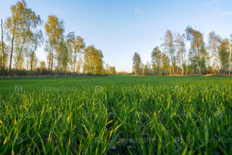 Весеннее сельскохозяйственное поле, засеянное зерновыми культурами, в окружении деревьев ранним утром
