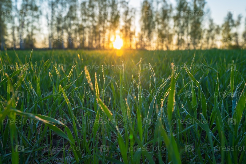 Молодые побеги пшеницы, покрытые утренней росой на фоне восхода солнца, крупным планом