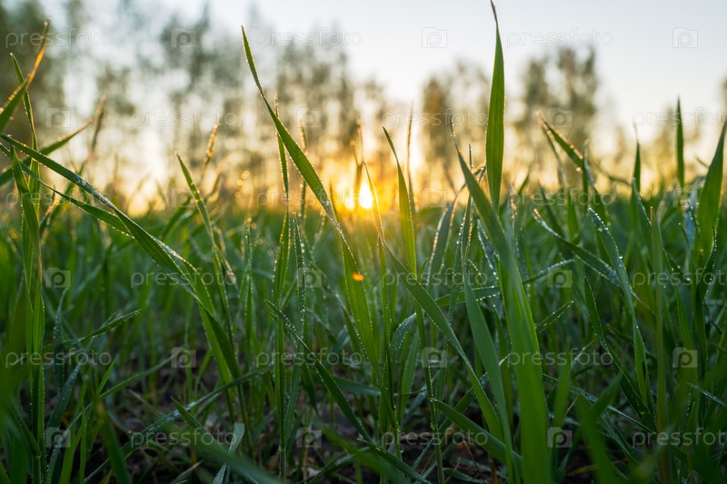 Молодые побеги пшеницы, покрытые утренней росой на фоне восхода солнца, крупным планом