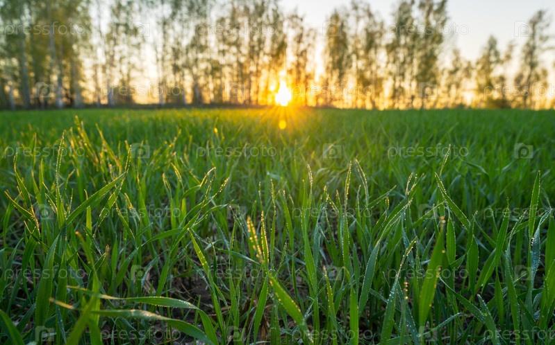 Молодые побеги пшеницы, покрытые утренней росой на фоне восхода солнца, крупным планом