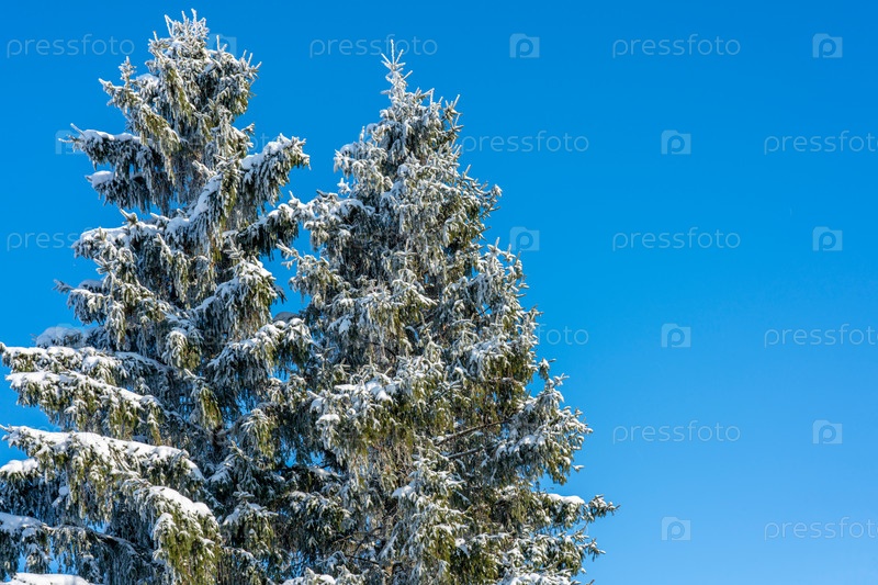 Открытка, две огромные пушистые голубые ели, покрытые снегом на сплошном фоне голубого неба