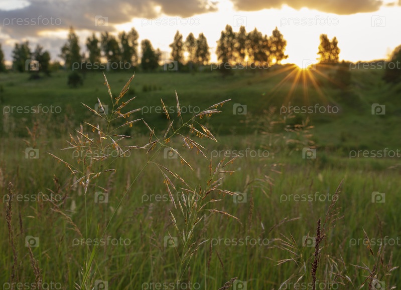 Летний пейзаж восхода солнца, луговая трава в свете. Природный летний пейзаж