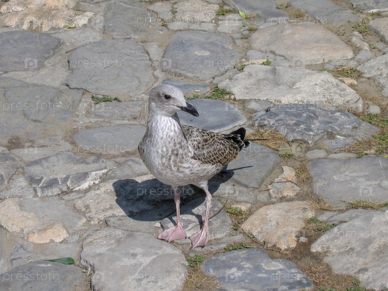 Чайка стоит на булыжной мостовой, крупным планом