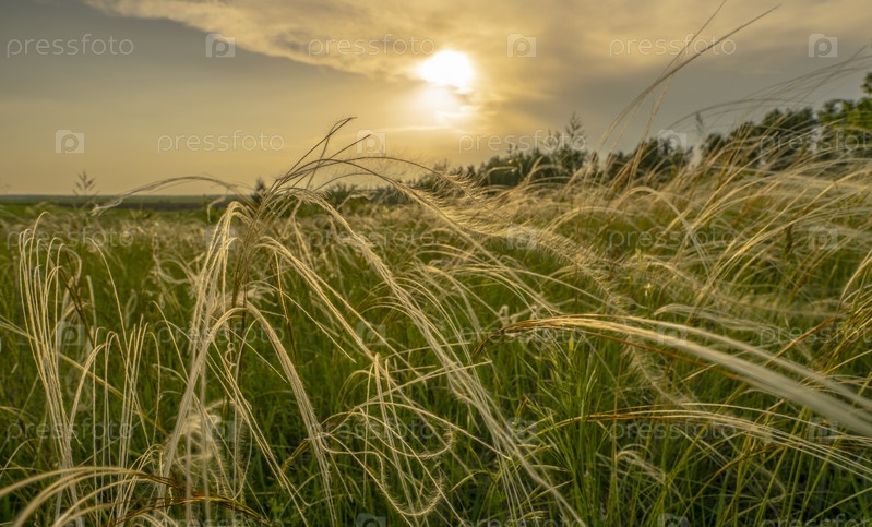 Травяной ковыль на лугу в свете заходящего солнца на фоне березовой рощи