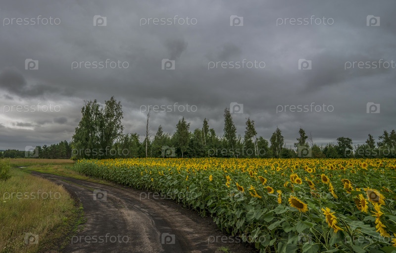 Поле подсолнечника во время шторма. красивый пейзаж