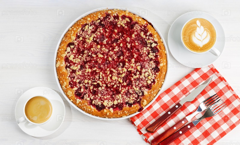 Домашний ягодный пирог с малиной и две чашки кофе на белом деревянном столе. Вид сверху