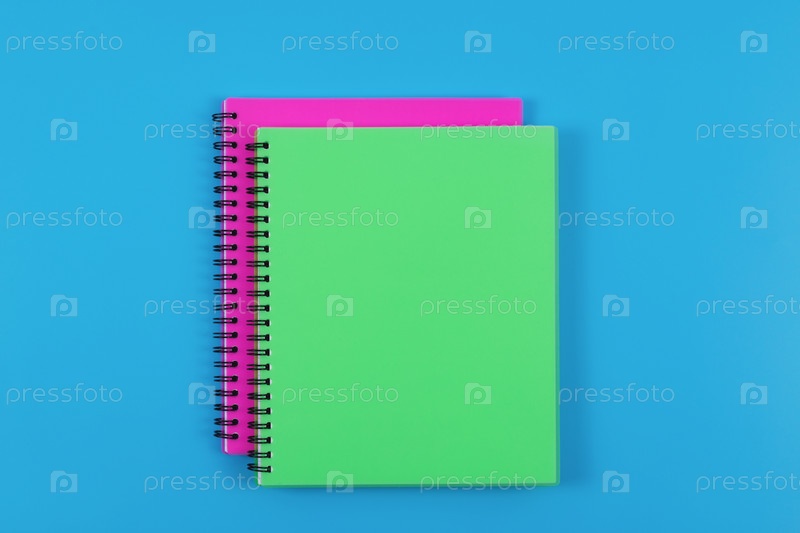 Верхний вид зеленых и пурпурных закрытых спиральных журналов, выделенных на синем фоне