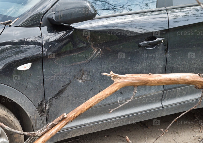 Сильный ветер сломал дерево, упавшее на автомобиль на стоянке. незначительные повреждения автомобиля