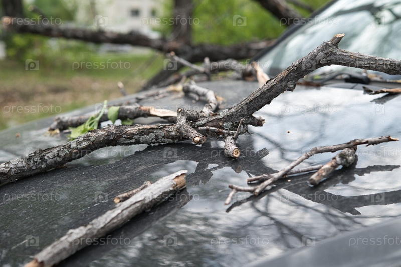 Сильный ветер сломал дерево, упавшее на автомобиль на стоянке. незначительные повреждения автомобиля