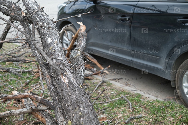 Сильный ветер сломал дерево, упавшее на автомобиль на стоянке. незначительные повреждения автомобиля