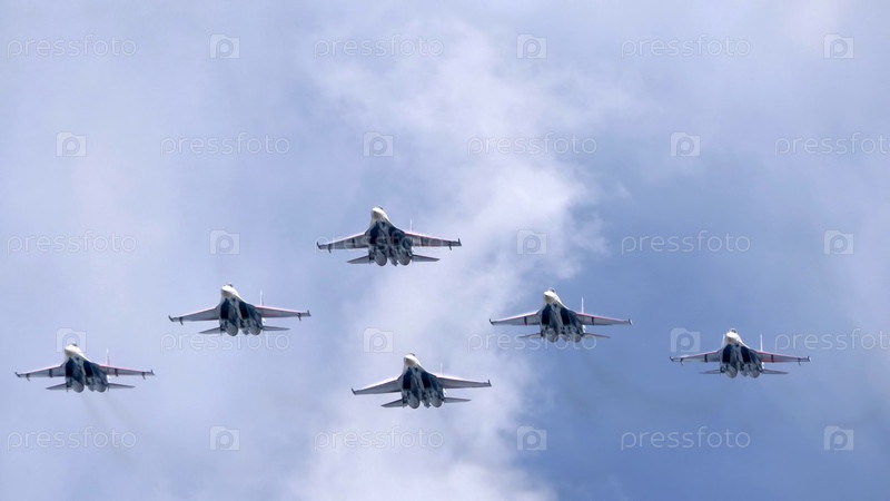 Москва Россия Аэродром Жуковский 25 июля 2021 года: Пилотажные группы Русские Витязи на самолетах Су-35 Международного аэрокосмического салона МАКС-2021