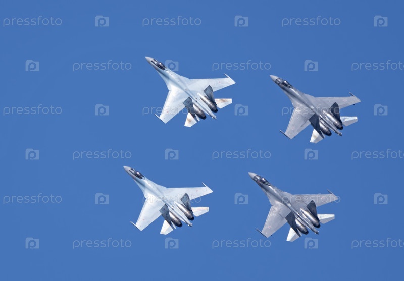 Москва Россия Аэродром Жуковский 25 июля 2021 года: Пилотажные группы "Соколы России" на самолетах Су-35 международного аэрокосмического салона МАКС-2021