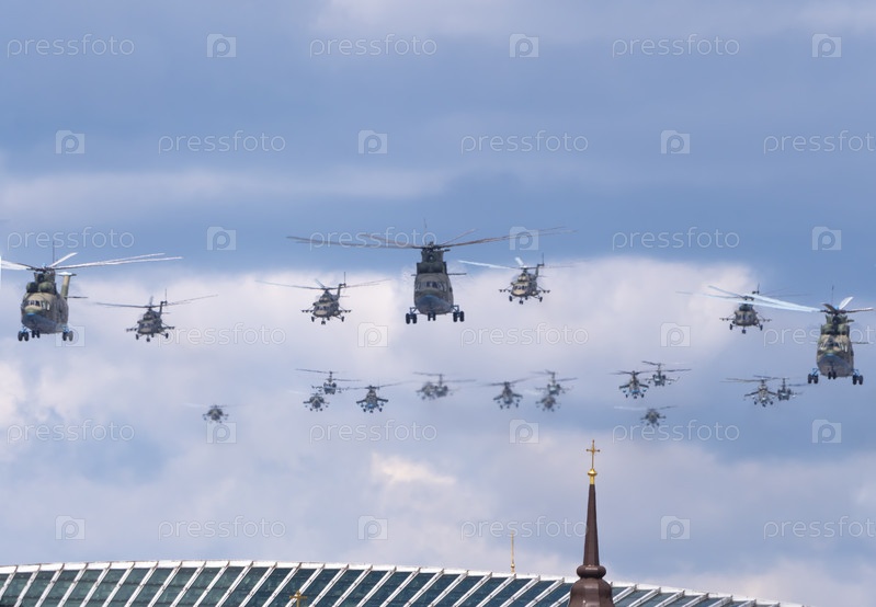 МОСКВА, РОССИЯ - 7 мая 2021 года: Авиапарад в Москве. Вертолеты Ми-26 и Ми-8АМТК летают в небе на параде Победы в Великой Отечественной войне в Москве, Россия