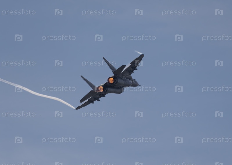 Москва Россия Жуковский аэродром 31 августа 2019 года: пилотажный МиГ-29 выполняет демонстрационный полет международного аэрокосмического салона МАКС-2019