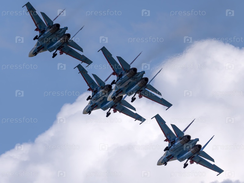 Москва Россия Аэродром Жуковский 25 июля 2021 года: Пилотажные группы Русские Витязи на самолетах Су-35 Международного аэрокосмического салона МАКС-2021