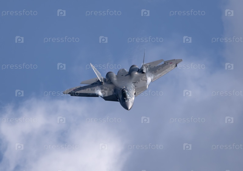 Москва Россия Аэродром Жуковский 25 июля 2021 года: Демонстрация новейшего российского истребителя Су-57 на международном аэрокосмическом салоне МАКС-2021