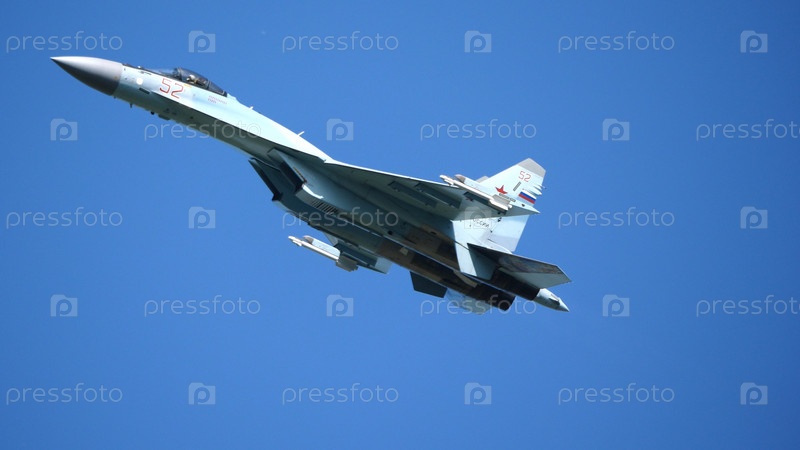 Москва Россия Аэродром Жуковский 31 августа 2019 года: пилотажный Су-35 выполняет демонстрационный полет международного аэрокосмического салона МАКС-2019
