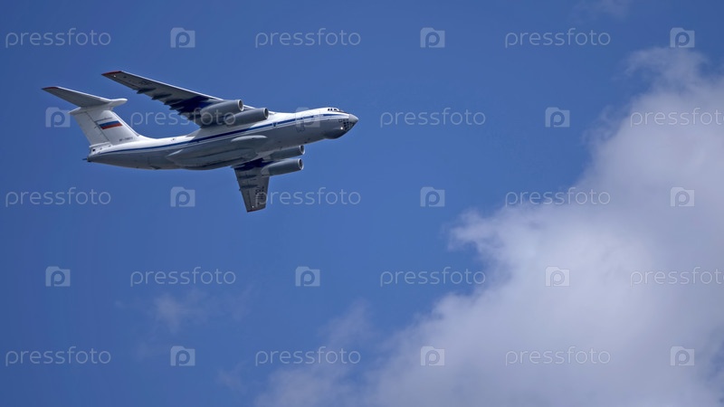 МОСКВА, РОССИЯ - 7 мая 2021 года: Авиапарад в Москве. 3 многоцелевых четырехмоторных стратегических авиалайнера Ильюшин Ил-76 летают в небе на параде Победы во Второй мировой войне в Москве, Россия