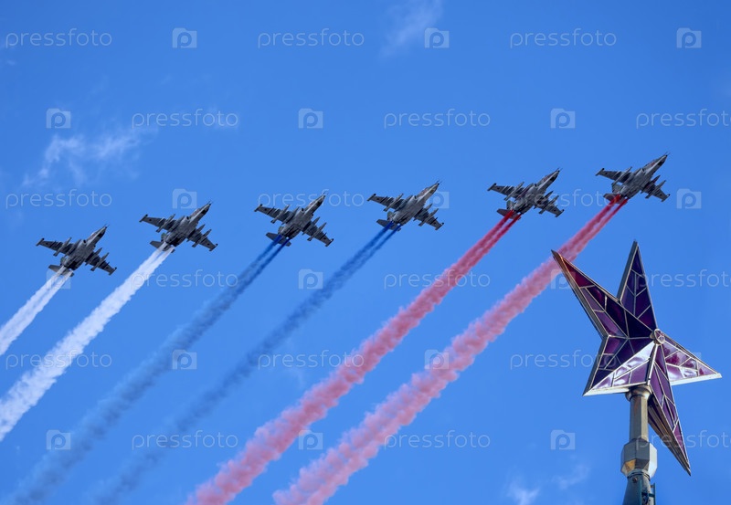 МОСКВА, РОССИЯ - 7 мая 2021 года: Авиапарад в Москве. Группа российских истребителей Су-25 с раскрашенным российским флагом в небе на параде Победы во Второй мировой войне в Москве, Россия