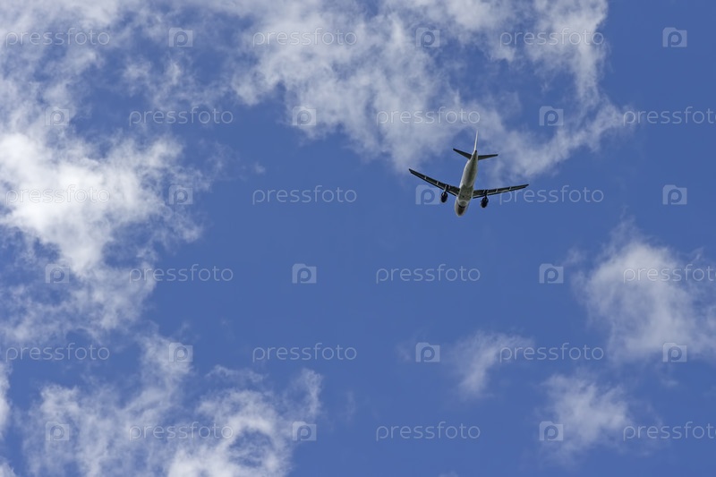 Самолет летит на фоне голубого неба