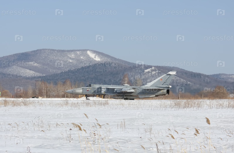 Военный реактивный бомбардировщик Су-24 "Фехтовальщик" взлет на форсаже