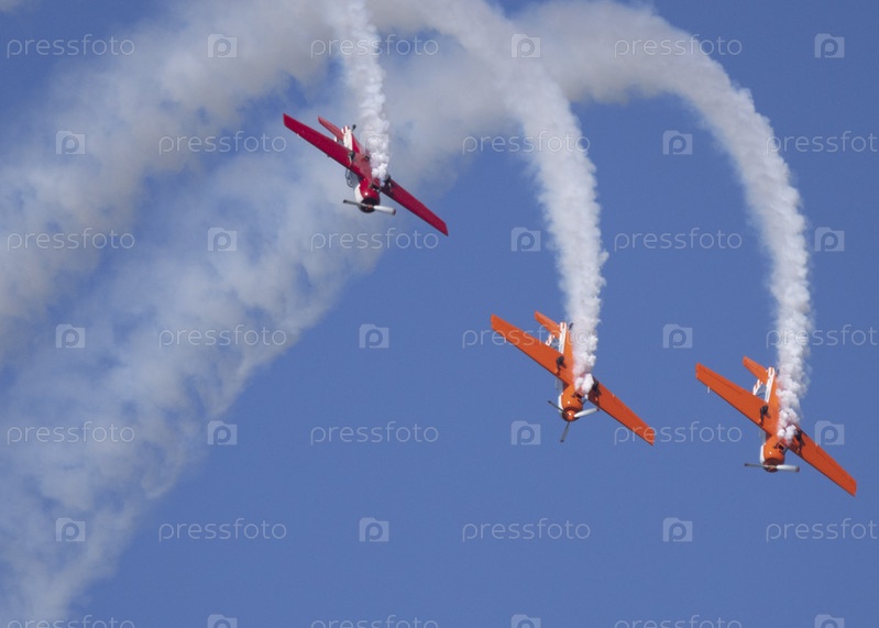 Москва Россия Аэродром Жуковский 31 августа 2019 года: выступление пилотажных самолетов Як-52 на международном аэрокосмическом салоне МАКС-2019