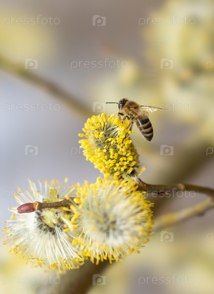 Цветение дерева Salix caprea в начале весны, пчела собирает нектар для опыления цветов