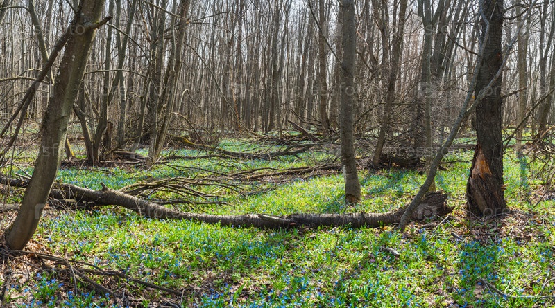 Пролеска цветет в весеннем диком лесу солнечным утром