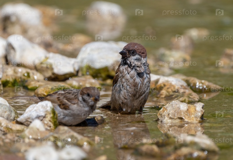 Воробей плавает в воде на скалистом берегу реки в жаркий летний день