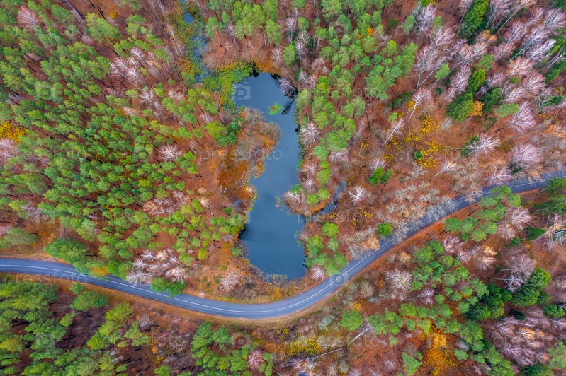Аэрофотосъемка лесного озера среди осеннего леса и извилистой дороги