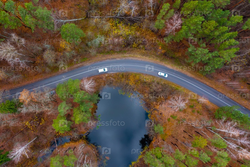 Аэрофотосъемка лесного озера среди осеннего леса и дороги, по которой едут две белые машины