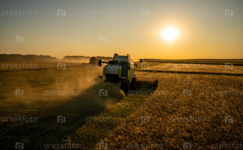 Сбор зерна в поле ячменя на закате,