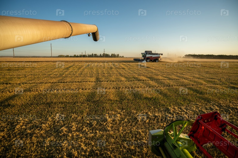 Уборка зерна в поле ячменя, вид из кабины комбайна