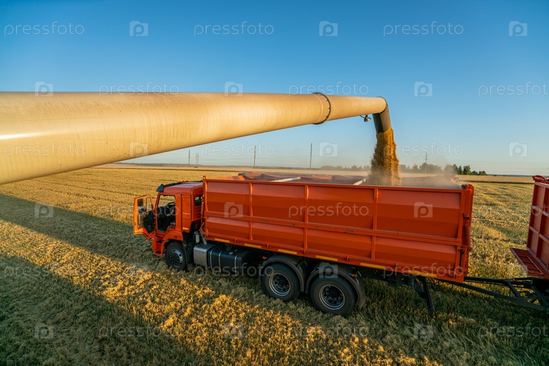 Комбайн высыпает молотое зерно в грузовик на поле во время сбора урожая