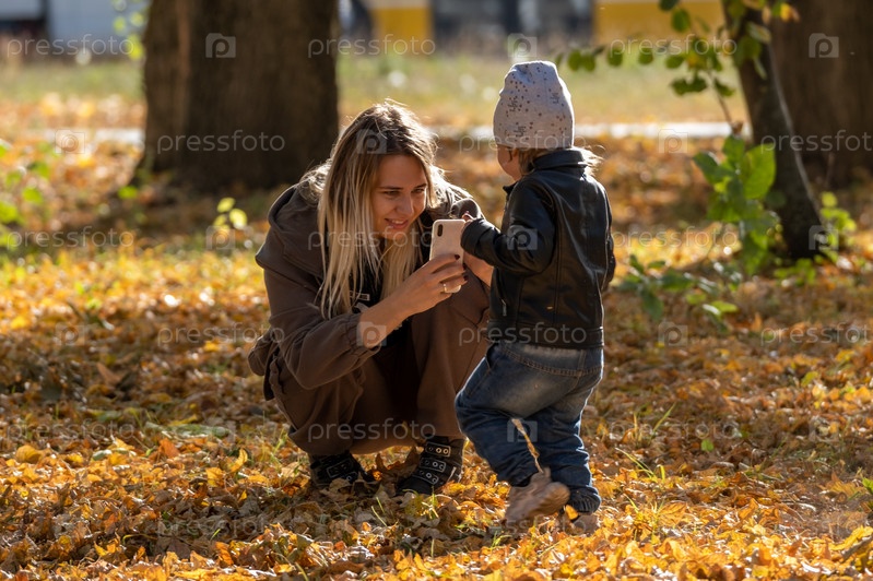 Счастливая мать и ребенок играют в осеннем парке