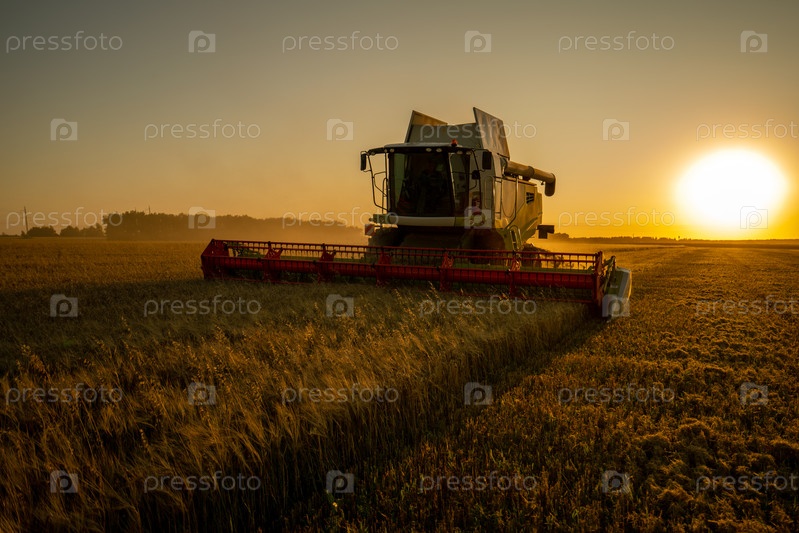 Сбор зерна в поле ячменя на закате, комбайны собирают зерно в золотой час на фоне заходящего солнца