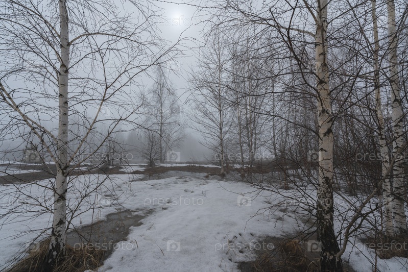 Березовая роща ранней весной в густом тумане