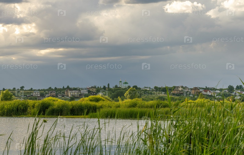 Закатное небо над рекой, на заднем плане деревня с церковью