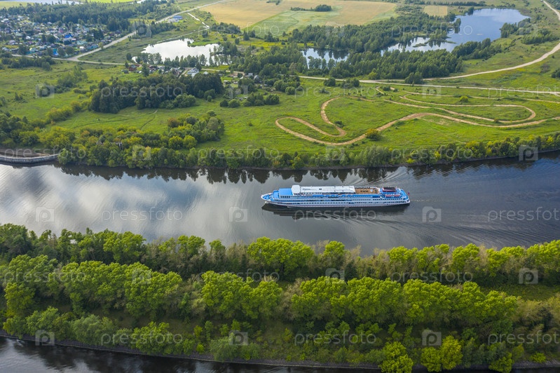 Река Волга, Россия. Туристический пароход, плывущий по руслу Волги, вид с квадрокоптера