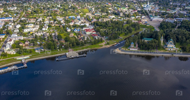 Углич, Россия. Исторический центр города, вид с Волги, воздушный беспилотник