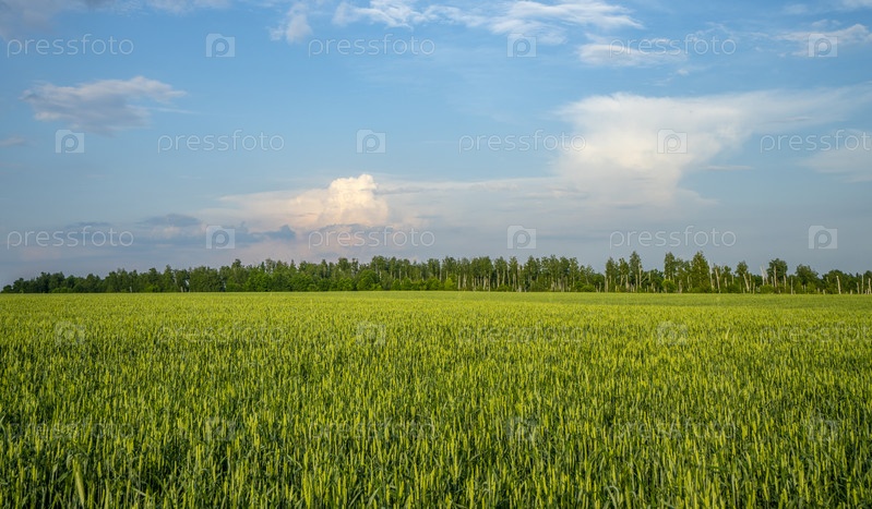 Зеленое поле зерновых культур на фоне голубого неба с облаками, освещенными лучами заката