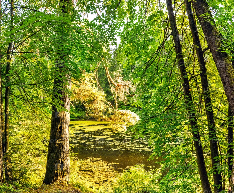 Болотистое озеро посреди леса летний день