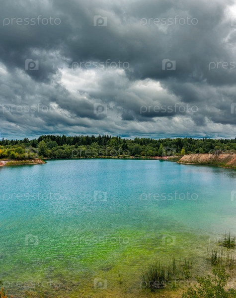 Озеро возле леса в пасмурный хмурый летний день