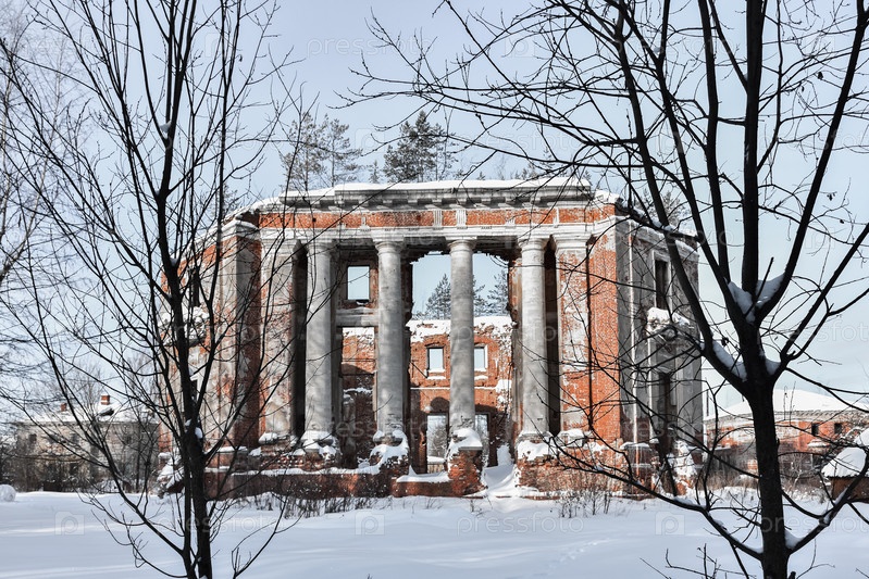 Заброшенная усадьба с колоннами, руины усадьбы зимой