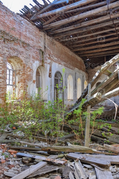 Интерьер заброшенного и разрушенного здания, растрепанная церковь в россии