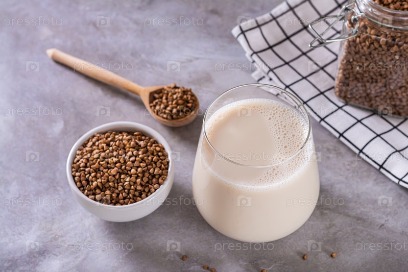 Безлактозное диетическое гречневое молоко в стакане и семечки в миске на столе