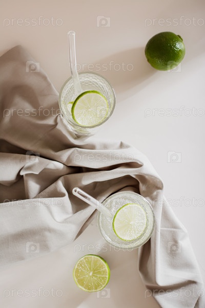 Крепкий зельтер со льдом и лаймом в стаканах на столешнице и вертикальный вид