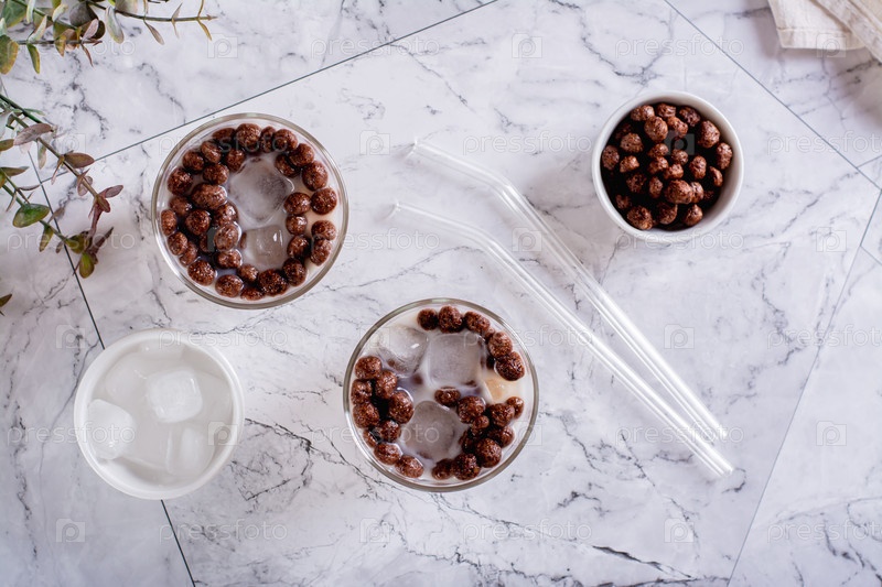Чай с пузырьковым молоком со льдом в стаканах на столе сверху
